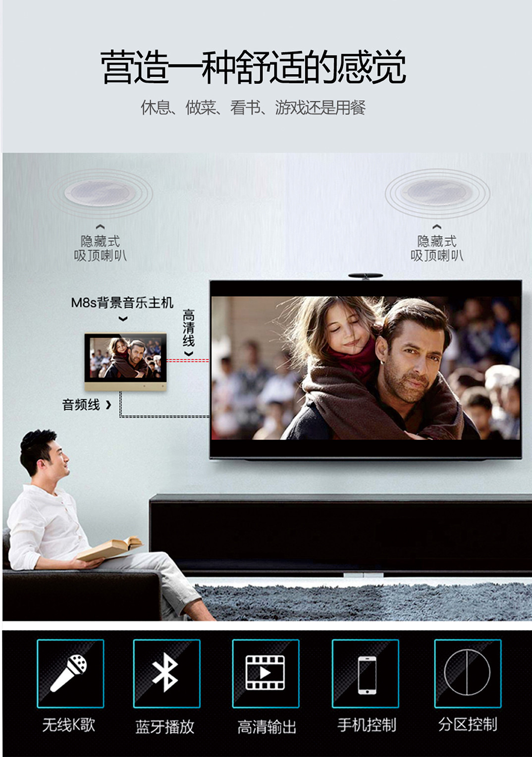 在一個家庭中,欣賞音樂的方式和途徑有很多。比如在客廳里,一般我們都會有音響,在書房、臥室里,我們也有微型組合音響,欣賞音樂是件很方便的事情。但是很多人往往把廚房、餐廳、衛生間這些每天要消耗很多時間的地方給遺忘掉。當我們辛苦地在廚房的油煙里煎炒烹炸的時候,打開背景音樂,聽著音樂做飯的感覺會讓我們覺得,就算瑣碎的生活也富有詩情畫意;我們在餐廳吃飯的時候,能有美妙的音樂伴隨該是多么愜意的事情;當我們在洗澡的時候,舒緩的輕音樂伴隨輕輕的水流聲和浴盆中彌漫的浴液泛起的氣泡,又是多么溫馨與浪漫。